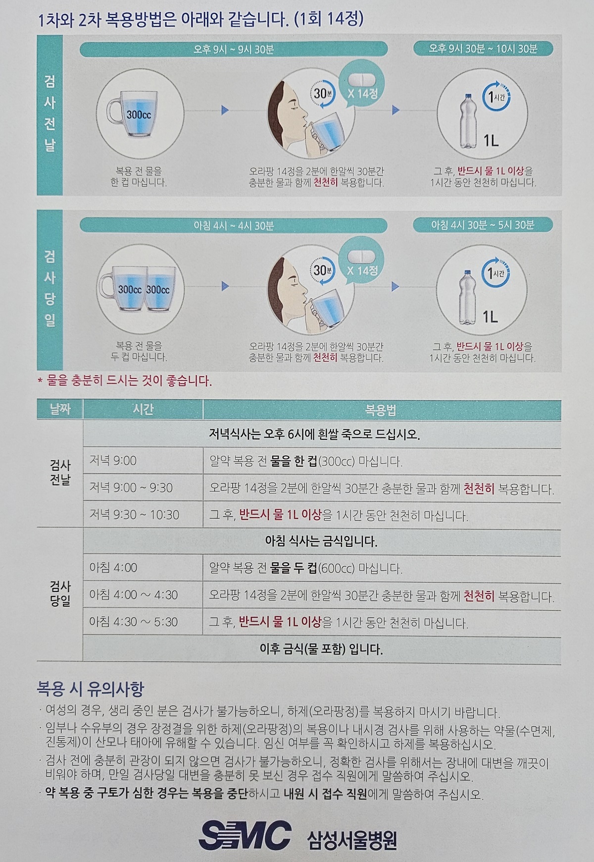 °Ë»ç ´çÀÏ: °Ë»ç 3-5 ½Ã°£ Àü ³ª¸ÓÁö 18Á¤ 6¾Ë¾¿ 3ȸ¿¡ °ÉÃÄ 240 mlÀÇ ¹°°ú ÇÔ²² º¹¿ë