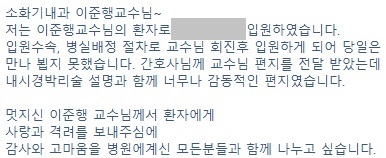 [2016-8-23] ÇÔ²² ÀÏÇÏ´ø °£È£»ç°¡ Åð»ç¸¦ ÇÏ¿´½À´Ï´Ù. °¨»çÀÇ ÆíÁö¸¦ ³²°å´Âµ¥... "´©±¸¿¡°Ô³ª °øÁ¤Çϰí"¶ó´Â ºÎºÐÀÌ ÀÖ¾î ¹Ý°¡¿ü½À´Ï´Ù. Á¦°¡ Áø·áÇÏ´Â ¸ð½ÀÀÌ µ¿·áÀÇ ´«¿¡ °øÁ¤ÇÑ Áø·á·Î ºñÃÆ´Ù´Â °ÍÀÌ °í¸¿°í ÀÚ¶û½º·´½À´Ï´Ù. »çȸÀû ½ÅºÐÀ̳ª ûŹ ¿©ºÎº¸´Ù´Â 'ÁßÇÑ Áúº´À» °¡Áø ȯÀÚ¸¦ Áß¿äÇÏ°Ô »ý°¢'ÇÏ´Â Á¦ öÇÐÀ» ÀÎÁ¤ÇØ Áּż °¨»çÇÕ´Ï´Ù. º´¿ø¿¡¼´Â Å« º´À» °¡Áø ȯÀÚ°¡ ÃÖ°í VIPÀÔ´Ï´Ù.