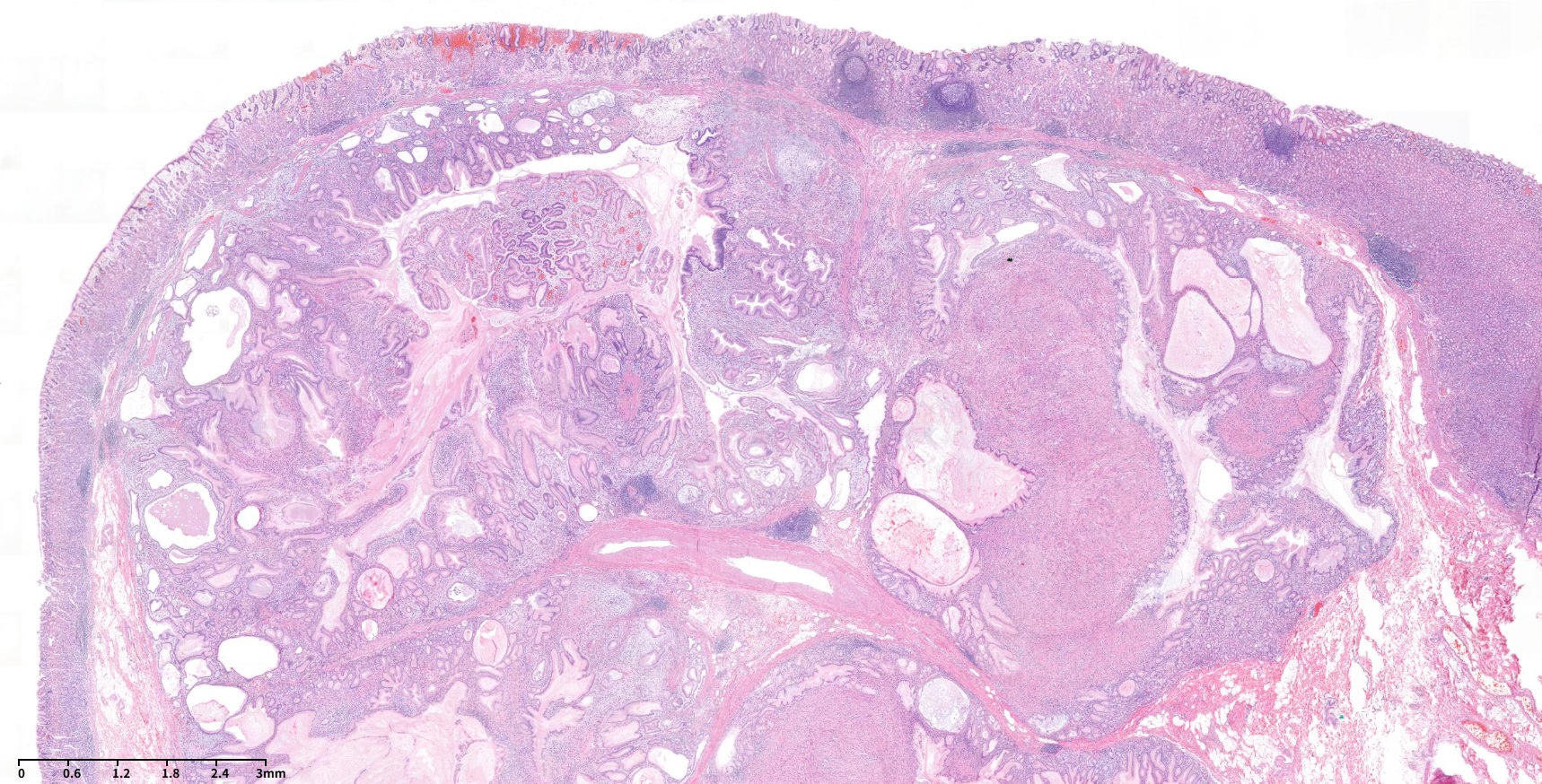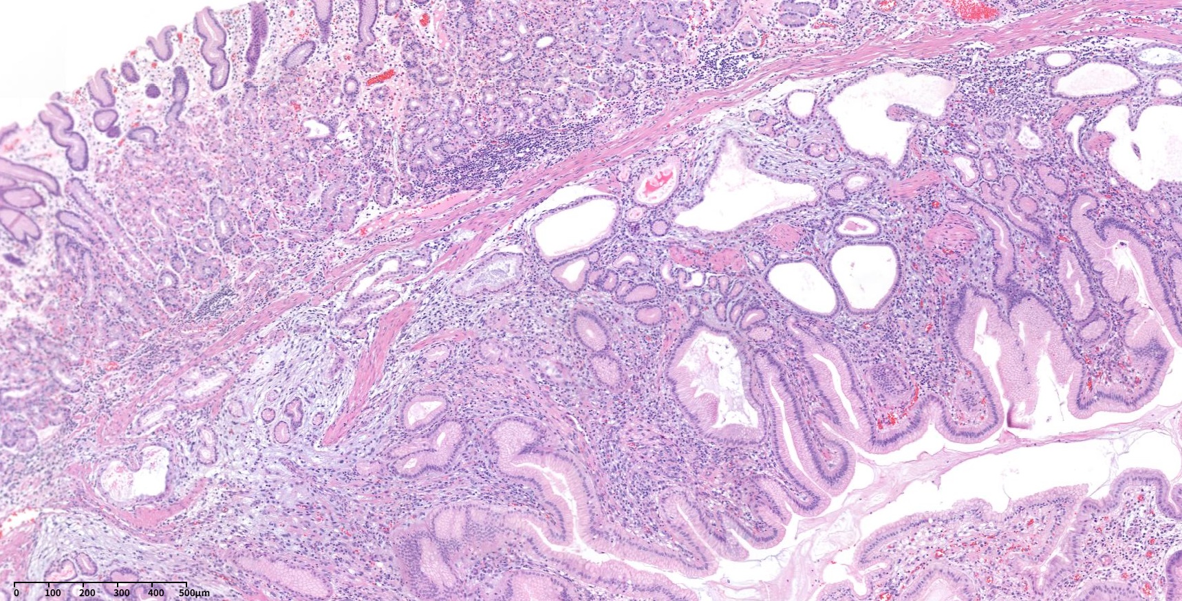 Wedge resection: herniated gastric mucosa in the submucosa with cystic dilatation