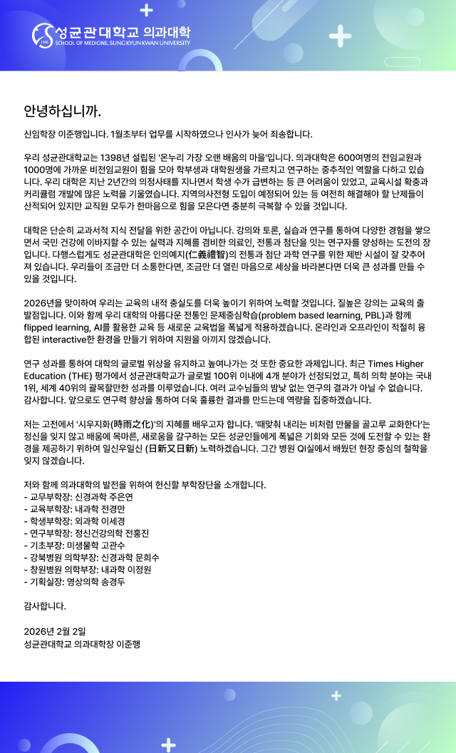 ¸ÕÀú 2025³â ¼º°ú¸¦ °£·«È÷ ¸»¾¸µå¸®°Ú½À´Ï´Ù. 2025³âµµ¿¡´Â ¿¬±¸·Â °È¿Í ±³À° ¼±ÁøÈ°¡ ÁÖ¿ä °úÁ¦»óȲÀ̾ú½À´Ï´Ù. ¿¬±¸·Â °È ºÎºÐ¿¡¼´Â ¼¼°èÀû ¼öÁØÀÇ ÀÇÇÐ ¿¬±¸ °æÀï·ÂÀ» È®º¸Çϰí, ¿¬±¸ ¼º°úÀÇ ÁúÀû °íµµÈ ¹× ±¹Á¦Àû À§»ó Á¦°í¸¦ À§ÇÏ¿© ³ë·ÂÇÏ¿´½À´Ï´Ù. / ±Ý¹ø THE ¼¼°è ´ëÇÐ Æò°¡¿¡¼ ¿ì¸® ¼º±Õ°ü´ëÇÐÀÌ °ý¸ñÇÒ¸¸ÇÑ ¼ºÀåÀ» ÀÌ·é °ÍÀº Å« °æ»ç°¡ ¾Æ´Ò ¼ö ¾ø½À´Ï´Ù. ±×Áß¿¡¼µµ ÀÇÇко߰¡ ¼¼°è 40À§, ±¹³» 1À§¸¦ ´Þ¼ºÇÑ °ÍÀº º»ºÎÀÇ ¿À·£ Áö¿ø°ú ±³¼ö´ÔµéÀÇ ºÎ´ÜÇÑ ¿¬±¸ÀÇ °á°ú°¡ ¾Æ´Ñ°¡ »ý°¢ÇÕ´Ï´Ù. °¨»çÇÕ´Ï´Ù. ÁÁÀº ¼º°ú¸¦ À¯Áö ¹ßÀü½ÃÄÑ¾ß ÇÑ´Ù´Â Å« Ã¥ÀÓ°¨À» ´À³§´Ï´Ù. / FWCI Á¡¼ö¿Í ±¹Á¦°øµ¿ºñÀ²µµ ³ô¾ÆÁö°í ÀÖÀ¸¸ç, 2022³âºÎÅÍ 2025³â±îÁöÀÇ FWCI ÇÕÀÌ 500À» ÃʰúÇÏ´Â ±³¼ö°¡ 5¸íÀ̾ú½À´Ï´Ù. Á¤¹ÐÀÇÇб³½Ç À̽¿ø ±³¼ö°¡ 5000Á¡À» ÃʰúÇÏ¿´°í ´Ù¸¥ 4ºÐÀº Ç÷¾×Á¾¾ç³»°ú ±³¼ö´ÔµéÀ̾ú½À´Ï´Ù. / ÀÇ´ë¿¡¼´Â ±¹Á¦ÇмúÁö P&FMÀ» ¹ß°£Çϰí ÀÖ½À´Ï´Ù. Impact factor´Â ¼øÁ¶·Ó°Ô »ó½ÂÇϰí ÀÖ¾î 2024³â 3.0À̾ú½À´Ï´Ù. / 2025³â º»±³ HCR 6¸í Áß ±è´ë½Ä, ¹Ú¼¼ÈÆ, ¾È¸íÁÖ µî 3¸íÀÌ Àǰú´ëÇÐÀ̾ú½À´Ï´Ù. Àǰú´ëÇÐ ¿¬±¸ ¼º°ú°¡ ´ëÇÐ Àüü ¿¬±¸ ÆòÆÇ ¹× ÀοëÁöÇ¥ °³¼±¿¡ ±â¿©ÇÏ´Â ¹Ù°¡ Å©Áö¸¸, ¿¬±¸ºñ ¼öÁÖÀÇ ¾î·Á¿òÀÌ ÀÖÀ¸¹Ç·Î ÀÌ¿¡ ´ëÇÑ Á¤Ã¥Àû °ËÅä°¡ ÇÊ¿äÇÏ´Ù°í »ý°¢µË´Ï´Ù. ¾Æ¿ï·¯ ƯÁ¤ ¿¬±¸ ºÐ¾ß¿¡ ´ëÇÑ ÀÇÁ¸µµ°¡ Å©±â ¶§¹®¿¡ ¿¬±¸ Æ÷Æ®Æú¸®¿À ´Ùº¯È ³ë·ÂÀ» Áö¼ÓÇϰڽÀ´Ï´Ù. / ±³À°¼±ÁøÈ ºÐ¾ß¿¡¼ Á¤¿ø Áõ¿ø ¹× ÀÇÁ¤°¥µî µî ȯ°æ º¯È ¼Ó¿¡¼µµ ÇÐ»ç ¿î¿µ¾ÈÁ¤È¿Í Æò°¡ÀÎÁõ À¯Áö ¹× ±³À°Çõ½Å ±â¹Ý ¸¶·Ã¿¡ ³ë·ÂÇÏ¿´½À´Ï´Ù. Áö³ 2³â°£Àº ÀÇÁ¤ °¥µîÀ¸·Î ÀÎÇÑ ´ë±Ô¸ð ÈÞÇаú º¹±Í·Î ÀÎÇÏ¿© ÀûÁö ¾ÊÀº ¾î·Á¿òÀÌ ÀÖ¾úÁö¸¸ ÀÇÇб³À° Æò°¡ÀÎÁõÀ» ¹«»çÈ÷ Åë°úÇÏ¿´½À´Ï´Ù. ±³À°ºÎ ÇöÀå Á¡°Ë°ú °¨»ç¿ø ½ÇÁö °¨»ç µî ´ëÀÀÇÒ Àϵµ ÀûÁö ¾Ê¾Ò½À´Ï´Ù. / ±³À°ºÎ Àǰú´ëÇÐ ±³À°Çõ½Å Áö¿ø»ç¾÷ RISE¿¡¼ A µî±ÞÀ¸·Î »ç¾÷ºñ¸¦ ¹Þ¾Æ ±³À° Çõ½Å ±â¹Ý ¸¶·Ã¿¡ µµ¿òÀ» ¹Þ°í ÀÖ½À´Ï´Ù. / ÇöÀç ÀÇÇаú 1ÇгâÀº 24Çйø, 25ÇйøÀÌ ÇÑ ±³½Ç¿¡¼ ¼ö¾÷À» ¹Þ°í ÀÖ½À´Ï´Ù. Doubling ÇйøÀ̶ó°í ºÎ¸£°í ÀÖ½À´Ï´Ù.