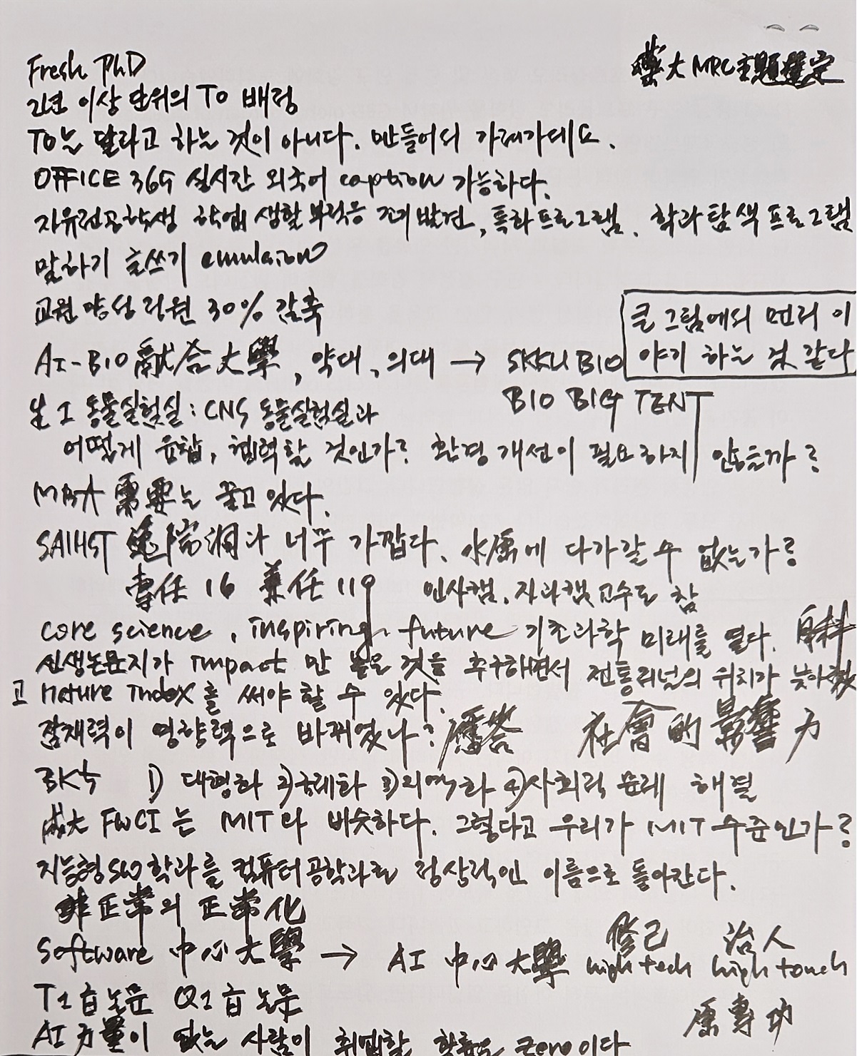 ¿¬±¸ ¼º°ú Áú Á᫐ °æÀï·Â °È¿¡ ´ëÇÏ¿© ¸»¾¸µå¸®°Ú½À´Ï´Ù. / ÀÓ»ó ºÎºÐÀº ÁÖ·Î º´¿ø¿¡¼ ÀÌ·ïÁö°í ÀÖÀ¸¹Ç·Î ´ëÇп¡¼´Â ±âÃÊ ¿¬±¸ Áß½ÉÀÇ ÀÎÀç È®º¸ ¹× À°¼ºÀÌ Áß¿äÇÕ´Ï´Ù. ¿¬±¸·Â Áß½ÉÀÇ ±³¿ø ä¿ëÀ» Áö¼ÓÇØ °¥ °ÍÀÔ´Ï´Ù. Áö¿ªÀÇ»çÁ¦ µîÀ¸·Î ÀÎÇÑ ÀÇ´ë»ý Áõ°¡¿Í Á¤³â ±³¼öÀÇ ÅðÁ÷¿¡ µû¸¥ ±âÃÊ ±³¿ø Ãß°¡ ä¿ëÀÌ ´õ¿í Áß¿äÇØÁø »óȲÀÔ´Ï´Ù. ¿Ã 3¿ùºÎÅÍ ¸ÞŸ¹ÙÀÌ¿ÀÇコÇаú°¡ Àǰú´ëÇÐ ¼Ò¼ÓÀ¸·Î ¿Å°ÜÁú ¿¹Á¤ÀÔ´Ï´Ù. ¿¬±¸ Æ÷Æ®Æú¸®¿À È®Àå ¹× ¿¬°Ô ¿¬±¸ °È¿¡ ³ë·ÂÇÏžx½À´Ï´Ù. / FWCI Á᫐ ¿¬±¸ Æ÷Æ®Æú¸®¿À °È¸¦ À§ÇÏ¿© GBD global burden of disease ºÐ¾ßÀÇ ¼º±Õ±¹Á¦º¸°Ç¿¬±¸¼Ò¸¦ ¼³¸³ÇϰڽÀ´Ï´Ù. / ÀÓ»ó ÀüÀÓ ±³¿øÀÇ ¿¬±¸ ±³À° ¿ª·®À» °ÈÇϱâ À§ÇÏ¿© ¾çÀû ³í¹® ½ÇÀû Áß½ÉÀÇ ±âÁ¸ Æò°¡ ±¸Á¶¸¦ º¸¿ÏÇÏ¿© ³í¹®ÀÇ ÁúÀû °³¼±À» ¹Ý¿µÇá´Â Æò°¡, À°¼º ü°è ¼³°è ¹× ´Ü°èÀû µµÀÔ ±â¹ÝÀ» ¸¶·ÃÇϰڽÀ´Ï´Ù. ´Ù¸¸ ÀÇÇÐ ±³À°ÇÐ ±³½Ç°ú Áö¿ª±â¹Ý ÀǷḦ À§ÇÑ ±³¿øÀÇ °æ¿ì´Â flexibleÇÏ°Ô Á¦µµ¸¦ ´ÙµëÀ» ¿¹Á¤ÀÔ´Ï´Ù. / ¿¬±¸ °æÀï·Â °È¸¦ À§ÇÏ¿© ¾ÈÀü¿¡µµ ¹æÁ¡À» µÎ°Ú½À´Ï´Ù. Á¤±â Á¡°Ë, À§Ç輺 Æò°¡, ¾ÈÀü ±³À°À» ÅëÇÏ¿© ¾ÈÁ¤ÀûÀÎ ¿¬±¸ ¼öÇà ȯ°æÀ» À¯ÁöÇϰí, ½ÇÇè½Ç ¾ÈÀüȯ°Ü °³¼±À» ÅëÇÏ¿© ¿¬±¸ Áß´ÜÀ̳ª »ç°í ¸®½ºÅ©¸¦ °ü¸®ÇϰڽÀ´Ï´Ù. ÀÇÇаü ³»¿¡ ÀÖ¾ú´ø ½ÇÇ赿¹°¼¾ÅͰ¡ CNS center·Î ÀÌÀüµÉ ¿¹Á¤ÀÔ´Ï´Ù. ÀÌ °ø°£À» ÀÇ´ëÀÇ ¿¬±¸ ȯ°æ °³¼±°ú ´Ã¾î³ Çлý °ø°£ ¼ö¿ä¿¡ ´ëÀÀÇÏ´Â ¿ëµµ·Î »ç¿ëÇϰíÀÚ ÇÕ´Ï´Ù. / ±³À° ºÐ¾ß¿¡¼ ÀÇÁ¤ °¥µî ÀÌÈÄ ¿©·¯ À̽´·Î ÀÎÇÏ¿© ±³À° °úÁ¤Àº ¾ÈÁ¤Àû °ü¸®°¡ ½±Áö ¾ÊÀº »óȲÀÔ´Ï´Ù. ±×°£ÀÇ ¿Ö°îµÈ ±³À° °úÁ¤À» 2026³â±îÁö ¸ðµÎ Á¤»óÈÇϰڽÀ´Ï´Ù. / 24Çйø°ú 25ÇйøÀÌ µ¿½Ã¿¡ ¼ö¾÷À» ¹Þ´Â Áï doubling ÇйøÀÇ ±³À° ¹× ÀÓ»ó ½Ç½À ¿î¿µÀÇ Á¦¹Ý ¹®Á¦¿¡ ´ëÇÏ¿© ¼±Á¦ÀûÀ¸·Î ÁغñÇϰڽÀ´Ï´Ù. Çг⺰ ±³À° ¿î¿µ °úÁ¤À» Á¤ºñÇϰí, ÇâÈÄ ÀÓ»ó½Ç½À ÁøÀÔ¿¡ ´ëºñÇÏ¿© ÀÏ¿ø¿ª ºôµù°ú »ï¼º¼¿ïº´¿ø, °ºÏ»ï¼ºº´¿ø, »ï¼ºÃ¢¿øº´¿ö°ú ±ä¹ÐÈ÷ ÇùÀÇÇϰڽÀ´Ï´Ù. / ¾Õ¼ ¼³¸íÇÑ 3´ë AI ½Ã½ºÅÛÀ» Áö¼ÓÀûÀ¸·Î °³¹ßÇϰڽÀ´Ï´Ù. / ÃÖ±Ù Áö¿ªÀÇ»çÁ¦¿¡ ´ëÇÑ ³íÀǰ¡ Ȱ¹ßÇÕ´Ï´Ù.