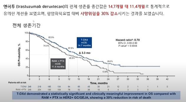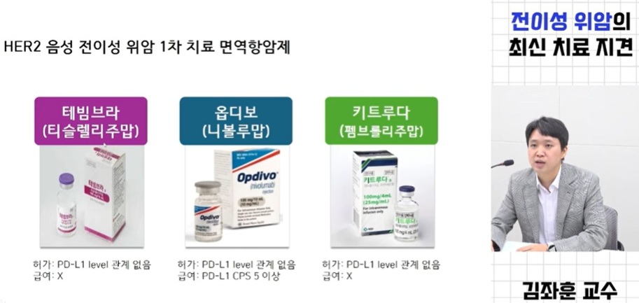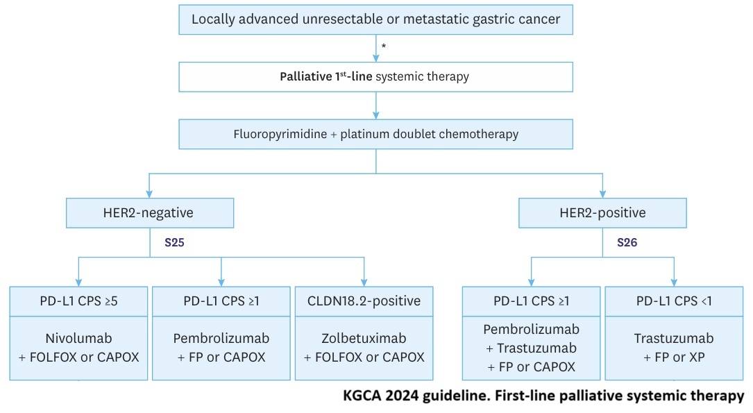 2022³â ´ëÇÑÀ§¾ÏÇÐȸ °¡À̵å¶óÀÎÀÇ systemic therapy¿¡ ºñÇÏ¿© 2024³â ´ëÇÑÀ§¾ÏÇÐȸ °¡À̵å¶óÀÎ systemic therapy´Â »ó´çÇÑ ¹ßÀüÀÌ ÀÖ¾ú½À´Ï´Ù. HER-2 negative¿¡¼´Â 2022³â¿¡´Â nivolumab¸¸ ÀÖ¾ú´Âµ¥ 2024³â¿¡´Â pembronizumab°ú zolbetuximabÀÌ Ãß°¡µÇ¾ú½À´Ï´Ù. HER-2 positive¿¡¼´Â pembronizumabÀ» ¾µ ¼ö ÀÖ´Â ºÎºÐÀÌ Ãß°¡µÇ¾ú½À´Ï´Ù.