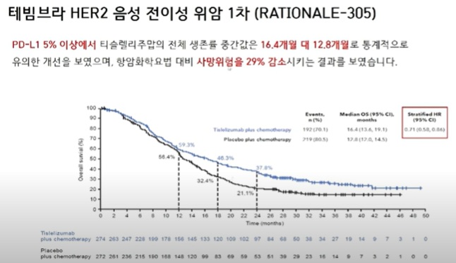 8) RATIONALE-305 (BMJ 2024) HER-2 negative regardless of PD-L1 score. °á°ú: Tislelizumab plus chemotherapy showed statistically significant improvements in overall survival versus placebo plus chemotherapy in patients with a PD-L1 TAP score of ¡Ã5% (median 17.2 months v 12.6 months; hazard ratio 0.74 (95% confidence interval 0.59 to 0.94); P=0.006 (interim analysis)) and in all randomised patients (median 15.0 months v 12.9 months; hazard ratio 0.80 (0.70 to 0.92); P=0.001 (final analysis)).