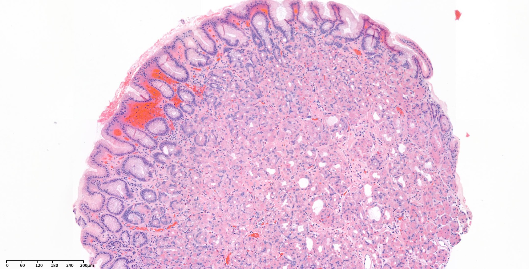 À§¹Ù´Ú»ùÇü»ù¾ÏÁ¾(adenocarcinoma of fundic-gland type)Àº À§ÀÇ ÁÖ¼¼Æ÷¿Í º®¼¼Æ÷ÀÇ ºÐȸ¦ º¸ÀÌ´Â ¼¼Æ÷·Î ±¸¼ºµÇ¾î ÀÖ´Â °íºÐÈÇü ¼±¾ÏÀ¸·Î WHO 5ÆÇ¿¡ óÀ½ µîÀçµÇ¾ú´Ù. ÀÌ Á¾¾çÀº ÇÙÀÇ ÀÌÇü¼ºÀÌ ¶Ñ·ÇÇÏ°Ô °üÂûµÇÁö ¾Ê°í ±¸Á¶Àû ÀÌ»óÀÌ ¸íÈ®ÇÏÁö ¾ÊÀº °æ¿ì°¡ ¸¹±â ¶§¹®¿¡, ³»½Ã°æ »ý°Ë ½Ã ÀÌÇü¼º Á¤µµ°¡ ³·Àº º´º¯À¸·Î ¿ÀÀ뵃 ¼ö ÀÖ´Ù. ÀϹÝÀûÀ¸·Î ¸¸¼ºÀ§¿°À̳ª Àå»óÇÇÈ»ýÀÌ ¾ø´Â À§¹Ù´Ú»ùÀÇ ½ÉºÎ À§Á¡¸·¿¡¼ ¹ß»ýÇÏ¿©, º´º¯ÀÇÅ©±â°¡ ÀÛ´õ¶óµµ Á¡¸·ÇÏÃþÀ¸·Î ħÀ±ÇÏ´Â °æ¿ì°¡ µå¹°Áö ¾ÊÀº °ÍÀ¸·Î º¸°íµÇ°í ÀÖ´Ù. ÇÏÁö¸¸ ÀÌ ¾ÆÇüÀº ¼¼Æ÷ÀÇ Áõ½Ä Ȱ¼ºµµ°¡ ³·°í ¸²ÇÁÀý ÀüÀÌ ¹× Àç¹ßÀÌ ¸Å¿ì µå¹°¾î¼, ¾çÈ£ÇÑ ¿¹Èĸ¦ °¡Áö´Â Àúµî±ÞÀÇ ¾Ç¼º Á¾¾çÀ¸·Î °£ÁֵȴÙ. (À§¾Ï º´¸® ¼Ò°ßÀÇ ÀÌÇØ ±è¹éÈñ, À̼ºÇÐ. Ç︮ÄÚ¹ÚÅÍÇÐȸÁö Á¾¼³, 2023)