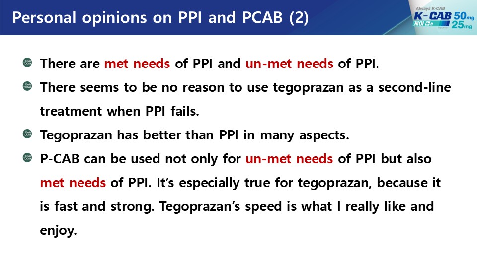 Àú¾ß tegorpazanÀ» »ç¿ëÇϰí ÀÖÁö¸¸ threshold therapy¿¡ À־ ´Ù¸¥ P-CABÀ̳ª PPI¿¡¼µµ ¾î´À Á¤µµ À¯¿ë¼ºÀÌ ¾øÁö ¾Ê½À´Ï´Ù. ±×·¯³ª on demand·Î ¹Ù²Ü ½ÃÁ¡¿¡´Â ºü¸¥ onsetÀ» °í·ÁÇØ¾ß ÇÕ´Ï´Ù.