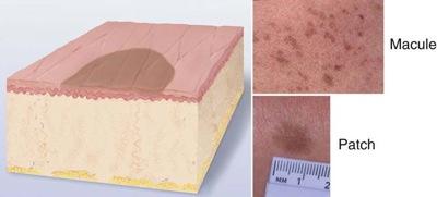 (1) Macules: These are areas of skin discoloration which are neither raised nor depressed.A macule is a flat, distinct, discolored area of skin less than 1 centimeter (cm) wide. A large macule i.e Areas of discoloration that are larger than 1 cm are referred to as patches.